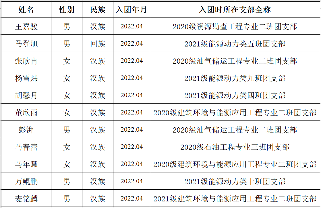 根据《团章》发展团员的相关规定,按照《中国共产主义青年团发展团员工作细则》,征求团员群众意见,经团支部大会表决和上级团委审批同意,拟将以下同学列为入团发展对象,现将名单进行公示。公示期为2022年4月27日至2022年5月3日止(公示期为7天)。如认为公示对象不符合团员标准、发展程序不符合规定,可通过来访、来信、来电等方式向学院团委、校团委反映,联系人:伍佳慧(18554615809)