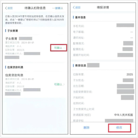 若需要修改、删除以前填报的专项附加扣除信息,可以在“专项附加扣除信息确认”页面进行【修改】或【删除】。