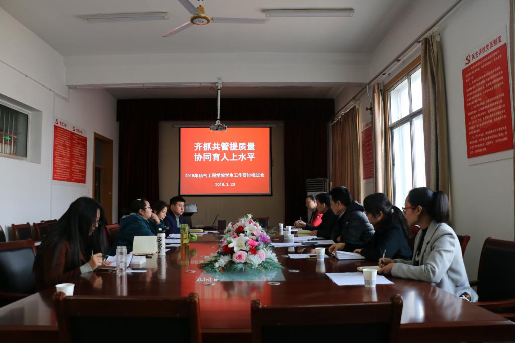 3月23日上午,油气工程学院在西配楼会议室举行了2018年学生工作推进研讨会,参与本次会议的人员有学生工作处副处长范秀娟、副处长蒋浩、油气工程学院院长梁敬升、党总支书记章志军、储运系主任刘坤、资源系主任胡秋媛、综合办公室主任郭瑾以及油气工程学院全体辅导员。会议由党总支书记章志军主持。