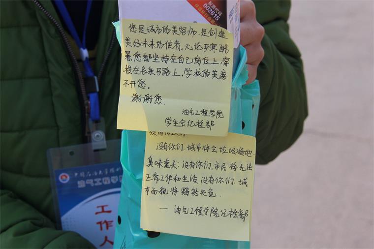 12月12号下午,油气工程学院学生会纪检部举行“校园送温暖”活动,为校园的环卫工人和宿管阿姨送去温暖和关心。