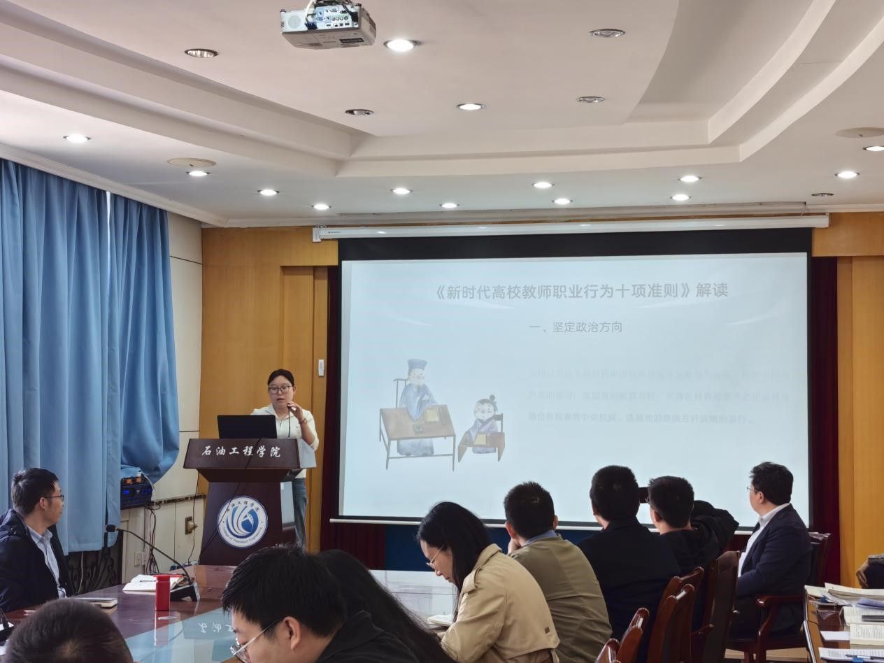 4月15日,石油工程学院在2028会议室组织全体教师专题学习《新时代高校教师职业行为十项准则》。会议由学院党总支副书记李聪聪主持。