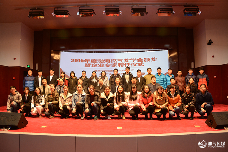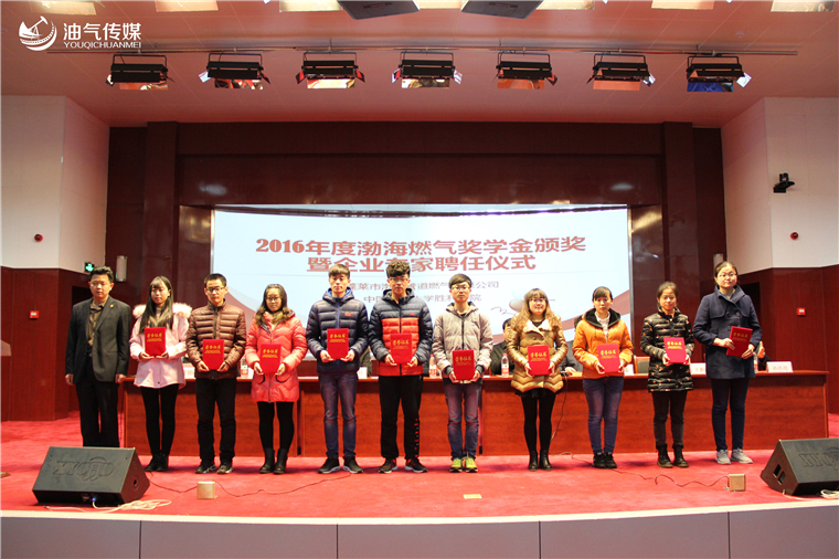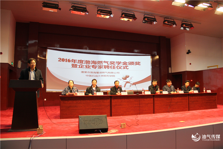 11月21日下午,2016年度“渤海燃气奖学金”颁奖暨企业专家聘任仪式在学院石大校区大学生活动中心小报告厅举行。蓬莱市渤海管道燃气有限公司副总经理丛林峰、总经理助理赵鑫、王振凯,胜利学院院长刘衍聪、副院长徐月利、学生工作处处长孙洪亮、油气工程学院执行院长吴明银以及相关职能部门负责人出席颁奖仪式。颁奖仪式由油气工程学院党总支书记殷丽主持。