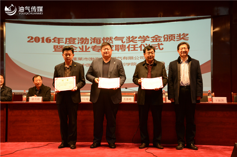 赵鑫宣读了2016年度“渤海燃气奖学金”获奖学生名单,与会领导为获奖学生颁奖。刘衍聪为学院第一届企业专家委员会委员丛林峰、赵鑫、王振凯颁发聘书