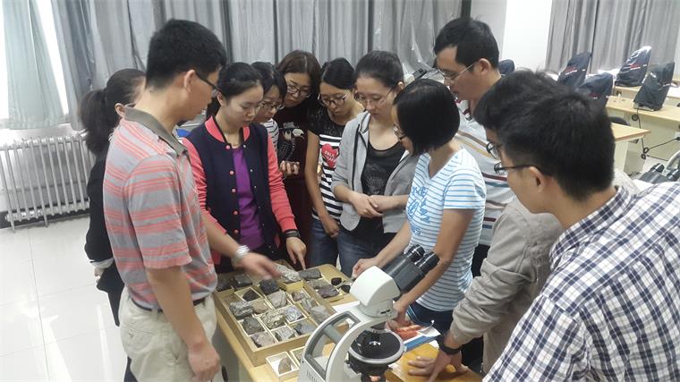 培训地点选在沉积学实验室及矿床学实验室,期间,针对学院矿物矿石学实验课程,孟教授分析了课程特点,着重讲述了岩浆岩、变质岩及矿石手标本观察及显微镜下的薄片特征,并分享了教学心得。每位老师都仔细的操作仪器,认真做课堂笔录。对于即将开展的“第三届全国大学生地质技能大赛”,孟教授详细介绍了比赛规则及内容,并结合胜利学院实际情况,对于如何组织和指导学生参赛,提出了建设性意见。培训最后,老师们还参观了在建的石油大学地质博物馆,欣赏了各类岩石矿物及古生物标本,在观看学生制作的地质模型时,对本院学生地质类教学方法有了新的思路。