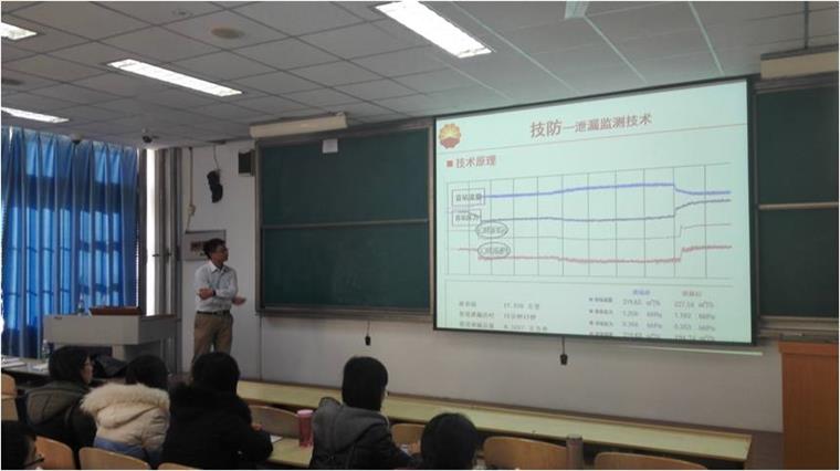 许斌博士首先介绍了我国油气管道的发展和运营管理现状,然后详细介绍了管道安全预警技术、管道泄漏检测技术及管道地质灾害检测技术等各技术的原理、发展、目前的研究水平和科研公关的方向。讲座中运用了很多现场图片为素材,让老师和同学对管道安全问题有了直观形象的了解和认识。尤其在讲述打孔盗油的监控技术,列举了大量的实际案例,让大家感受到管道安全和安全管理的重要性。