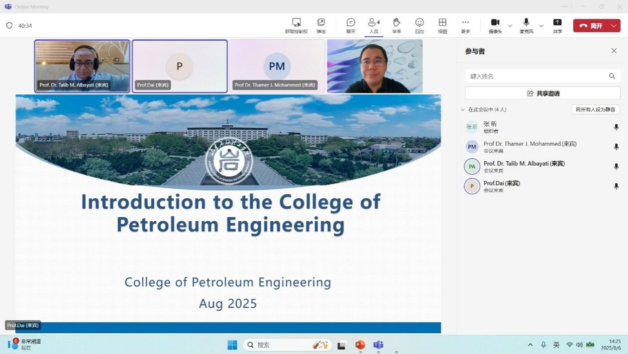 2025年8月6日,石油工程学院以线上形式同伊拉克科技大学就“油气流动保障与聚合物减阻技术”开展交流研讨。学院教师代晓东和张昕博士与伊拉克科技大学专家相聚云端,围绕减阻剂研发及绿色低碳储运展开深入交流。