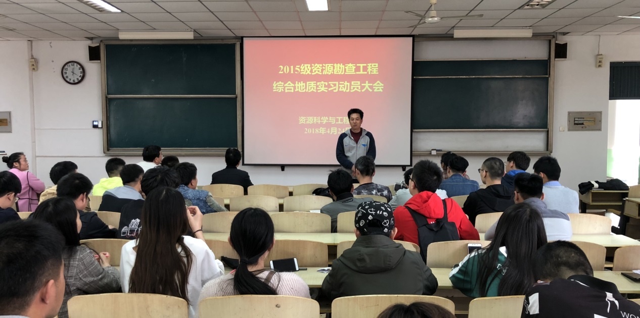 4月24日下午,我院资源科学与工程系在4教112召开2015级资源勘查工程专业综合地质实习动员大会。执行院长梁敬升、党总支书记章志军、副院长代晓东、资源系实习带队教师及2015级资源勘查工程全体学生参加了本次会议,会议由杨建磊老师主持。