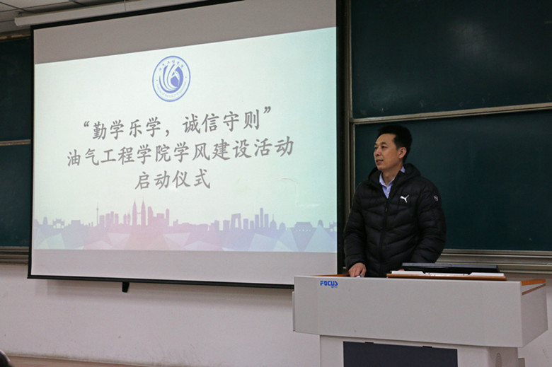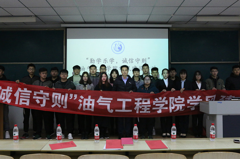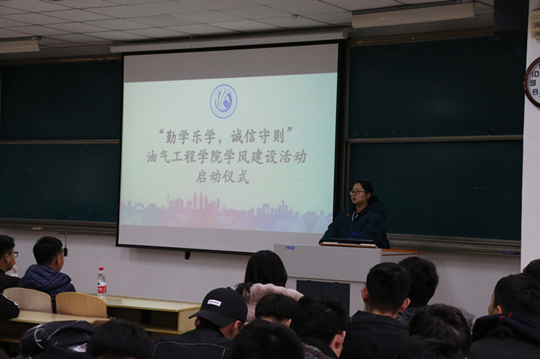 为了推进我院学风建设,营造良好的学习氛围,促进学生的自主学习理念。3月20日下午,在第四教学楼4102教室举行了“勤学乐学,诚信守则”学风建设活动启动仪式。油气工程学院党总支书记章志军、学生工作办公室主任毕菲菲、团总支书记胡洪翠、辅导员伍佳慧及学生代表们出席了本次仪式。