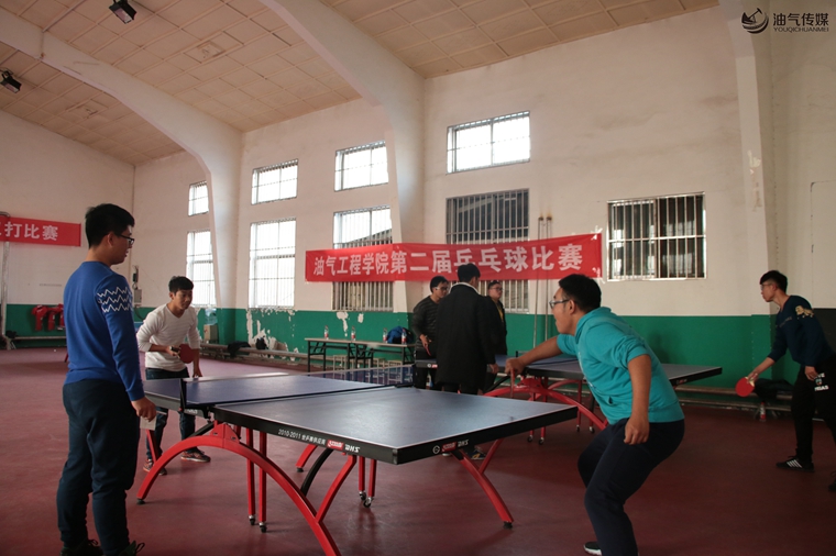 在油气工程学院学生会和油气阳光体育联盟----乒乓球队的组织下,比赛秉承“公平、公正、公开”的原则进行。本次比赛共组织5个专业代表队共60余名运动员参与其中,比赛项目分为男单、女单和团体项目。现场气氛热烈,观众时而为精彩的扣杀而喝彩,时而为顽强的防守而呐喊。经过激烈角逐,女单冠亚军分别被潘婕怡、张济妮两名同学获得。男单冠亚军分别被石宁乐、潘光辉两名同学获得。团体第一二三名分别是:石油工程、油气储运工程、油气储运技术三支代表队。