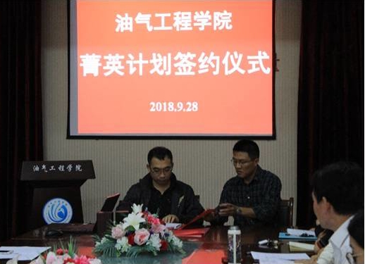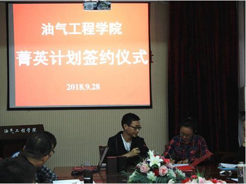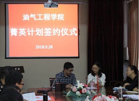 为进一步落实青年教师培养工作,充分发挥骨干教师的传、帮、带作用,油气工程学院于2018年9月28日下午在西配楼四楼会议室举行了“菁英计划”签约仪式。学校教学科研处副处长王贞,油气工程学院执行院长梁敬升、学院中层管理人员、签约教师以及全体专职教师出席了签约仪式。会议由油气工程学院执行院长梁敬升主持。