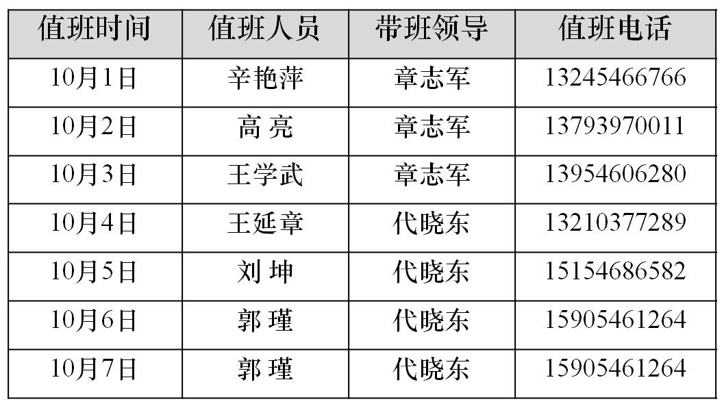 油气工程学院“十一”假期值班表