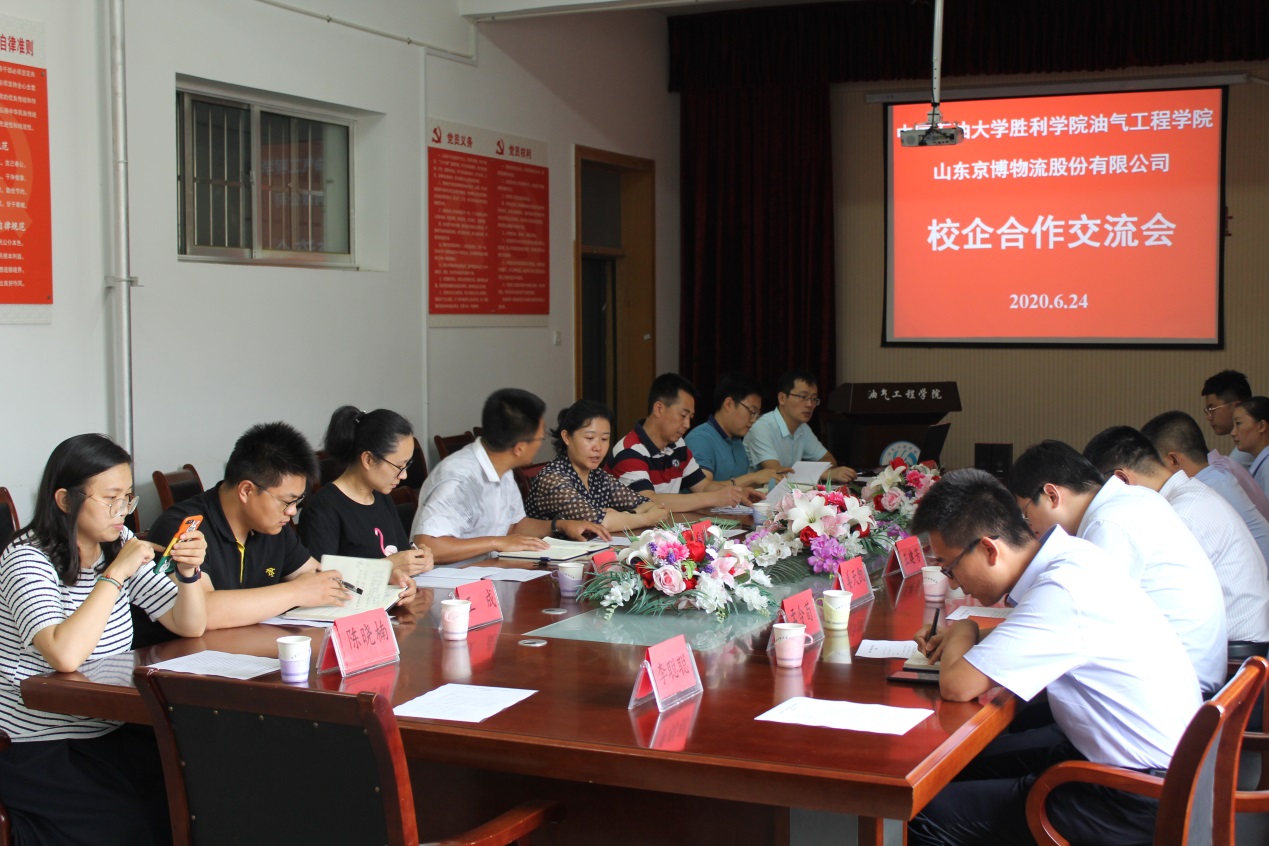 6月24日下午14时,我院与山东京博物流股份有限公司校企合作交流会在4004会议室举行。中国石油大学胜利学院副院长王晓勇,油气工程学院党总支书记章志军、院长代晓东、副院长辛艳萍、副院长高亮,学生工作处副处长蒋浩等校方代表,与来访的山东京博物流股份有限公司董事长兼总经理吴加宝一行,就校企合作、共建实习实践基地等方面议题展开洽谈。