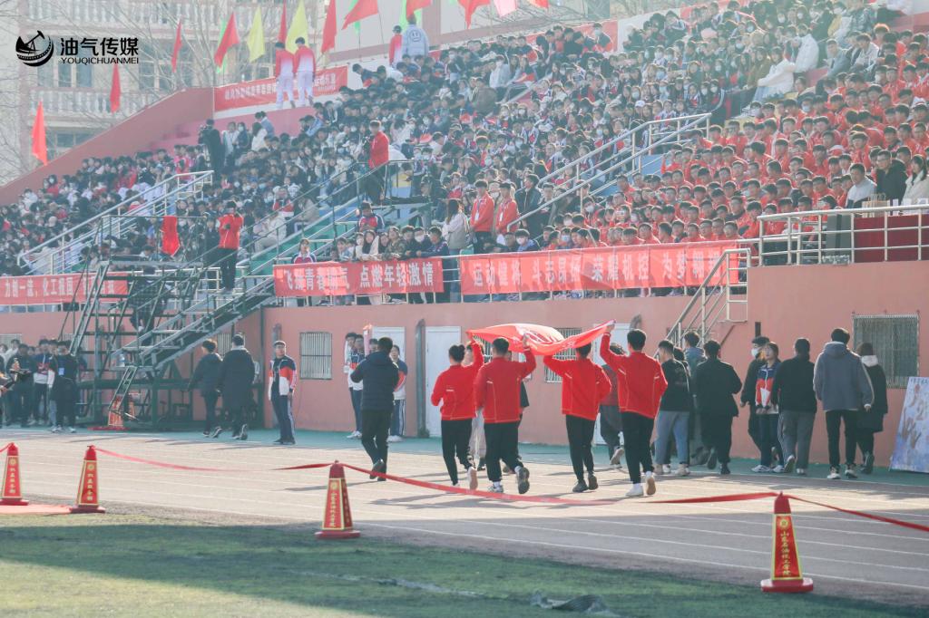 本次开幕式在全体人员的嘹亮国歌声中展开,随后以油气工程学院领导代晓东为起点传递火炬,学院领导代晓东带着象征着希望的火炬奔跑,将火炬传递下去,其他各院领导依次传递火炬,最后由学校领导刘衍聪点燃火炬盆。