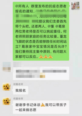 何蔓同志的志愿服务时间是到晚上的10点。站立4小时对这位经验丰富的教师来讲是必修技能,但她的心里还是不由地牵挂家里的亲人。何蔓同志的爱人由于工作原因经常出差,家里的老人身体状况也不理想,前段时间刚出院回家。“上有老下有小”可能是每位中年人不得不面临的难题,可不是每个人都做到何蔓同志这样,甚至于每当其他同志可以帮助她完成任务的时候,她也要主动请缨。就像她时常鼓励身边人的那句话——我们一起加油!