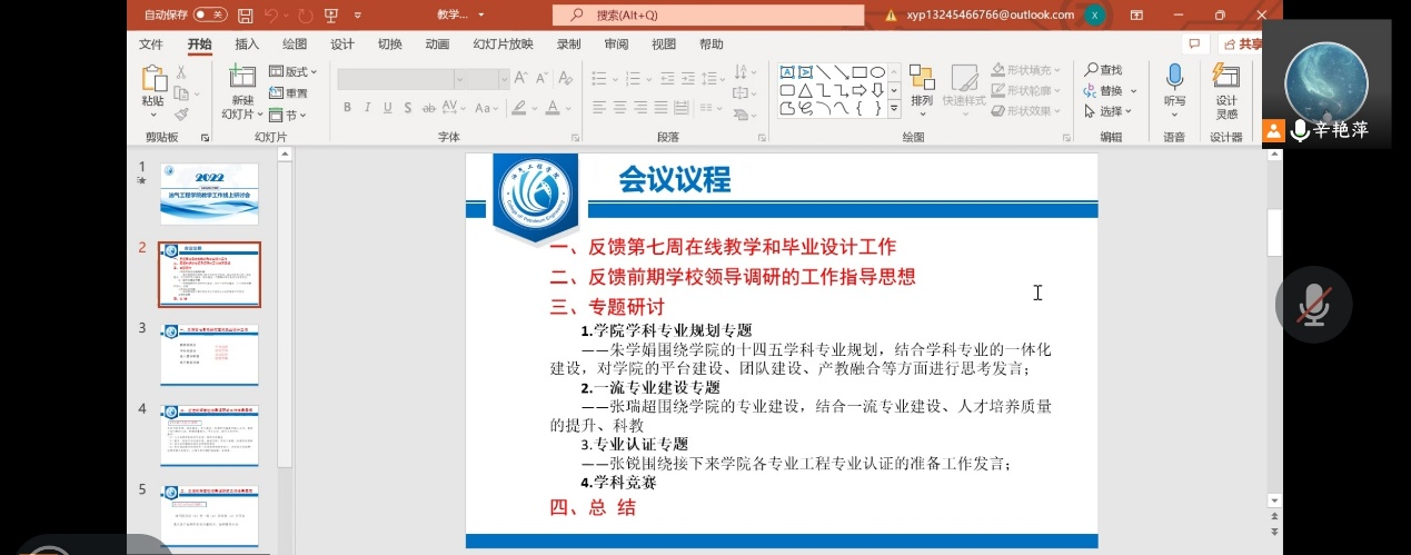 最后,代晓东和辛艳萍分别做总结发言,肯定了学院线上教学的效果以及各专业负责人对今后学科发展方向的定位,指出学院将紧紧跟随学校领导的指导思想,对照2022年学校工作要点,努力将油气工程学院各石油特色专业步入发展快车道。