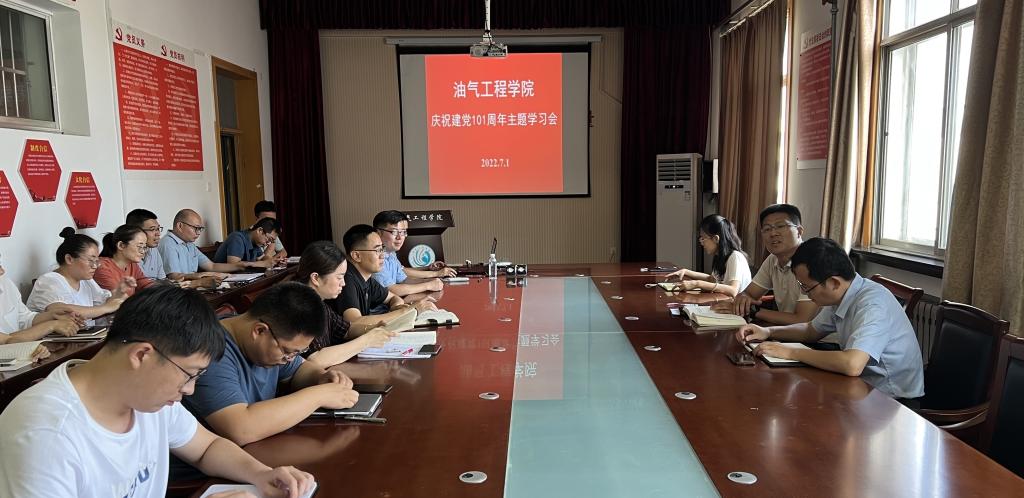 为庆祝中国共产党成立101周年,巩固拓展党史学习教育成果,不断提高教职工的思想政治素质,筑牢理想信念,7月1日上午,油气工程学院党总支在会议室4004开展庆祝建党101周年主题学习会。会议由党总支书记代晓东主持,学院全体教职工参加。