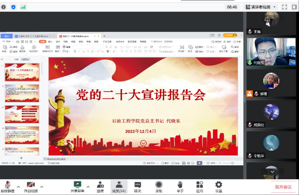 为提升广大党员同志对党的二十大精神的丰富内涵的认识,12月4日下午,我院党总支书记代晓东同志通过线上会议的形式对党的二十大精神进行了宣讲和解读,我院全体党员参加学习。
