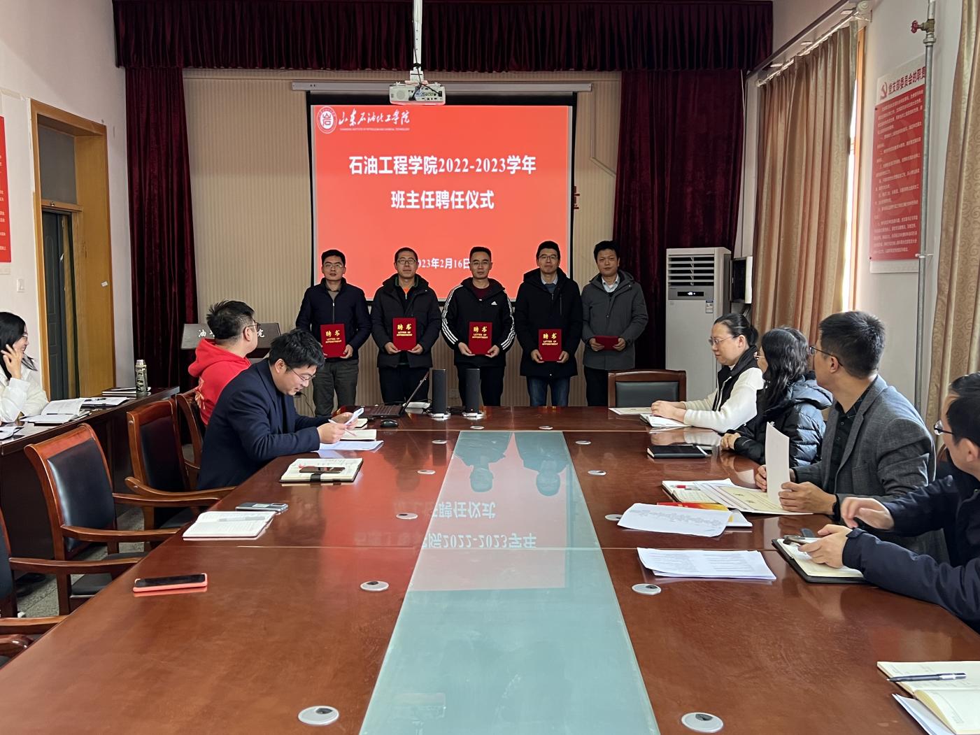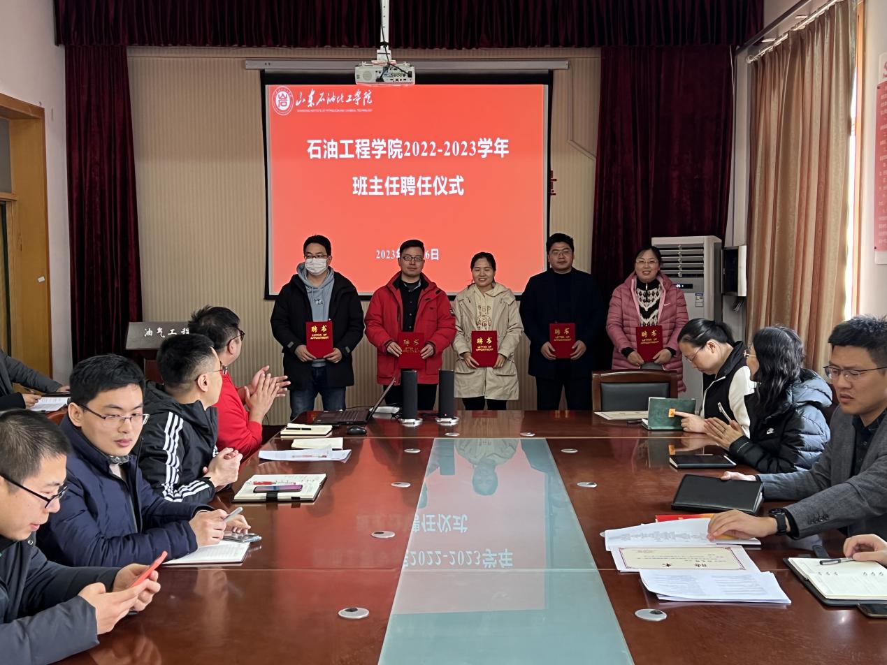 为进一步提升学院思想政治教育水平和人才培养质量,着力构建“新时代大思政育人体系”,形成全员育人良好环境,2月16日上午,石油工程学院在西配楼4004会议室举行2022级班主任聘任仪式暨开学第一课主题活动。会议由学院党总支书记代晓东主持,学院全体老师参加。