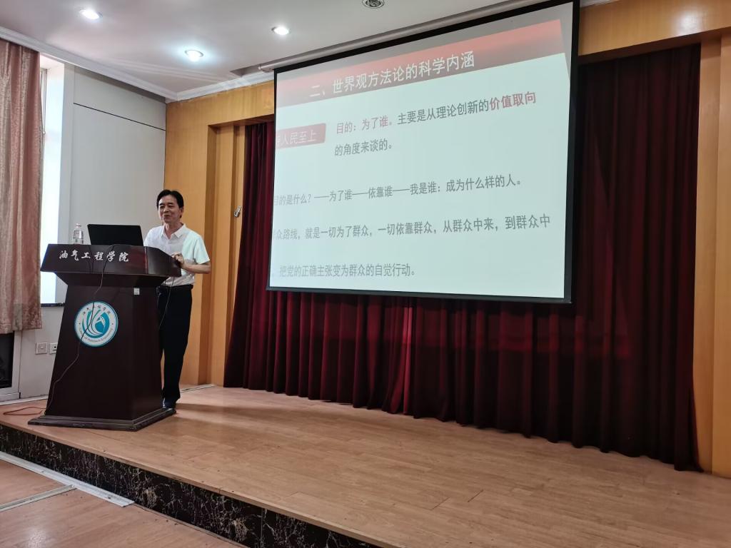 梁敬升教授以《习近平新时代中国特色社会主义思想世界观和方法论》为题,通过讲述世界观与方法论的理论基础、科学内涵、思维方法,指导全体党员通过历史看现实、透过现象看本质,把我好全局与局部、当前和长远、宏观和微观、主要矛盾和次要矛盾、特殊和一般的关系,不断提高战略思维、历史思维、辩证思维、系统思维、创新思维、法治思维、底线思维能力。
