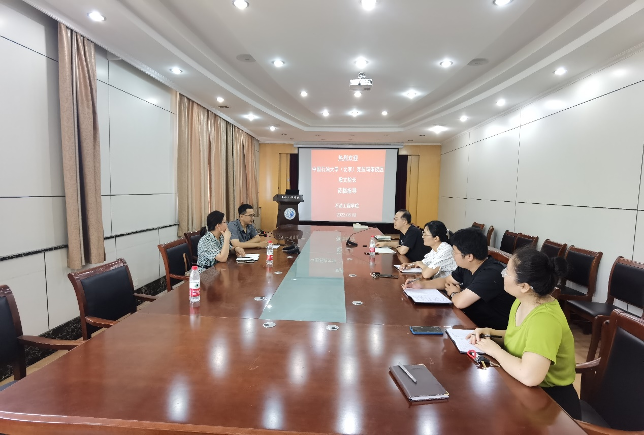 2023年8月8日,中国石油大学(北京)克拉玛依校区文理学院殷文院长来我院座谈交流。石油工程学院常务副院长王蛟、李聪聪、资源科学与工程系朱学娟、孙志峰、孔雪、苏阳等教师参加。