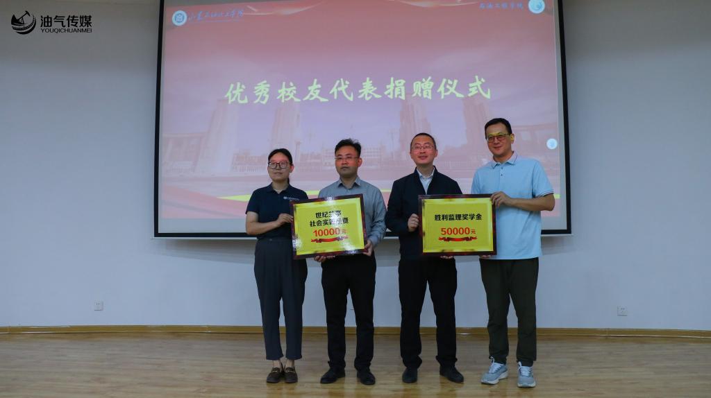 优秀校友2008级石油工程专业吴丰代表山东胜利建设监理股份有限公司向学院捐赠“胜利监理”奖学金50000元,2013 级石油工程专业黄居凯向学院捐赠“世纪兰亭”助学金10000元。