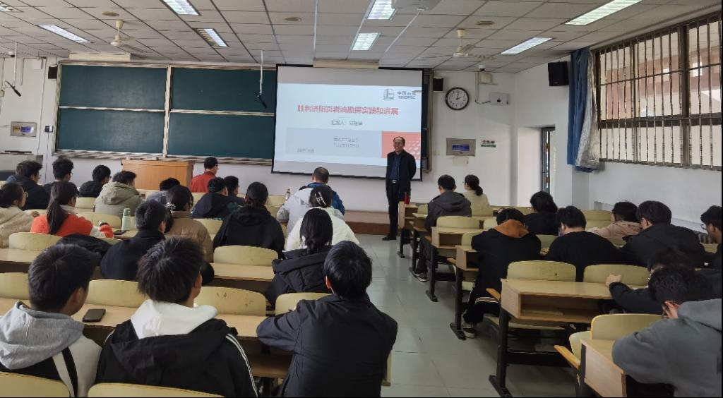 交流会第二阶段,邱贻博首席为我院师生做了生动形象、深入浅出的学术报告。在四教4405,邱贻博首席为资源勘查工程专业学生和相关老师,开展了题为“胜利油田济阳坳陷页岩油勘探实践和进展”的学术讲座,从页岩油的概念、济阳坳陷页岩油勘探进展、济阳坳陷页岩油地质认识和下步方向等四个方面做了精彩的讲解和实例分析。页岩油气勘探是当下国内外油气勘探的热点和重点,本次讲座对开阔资源勘查工程专业师生的专业视野,了解行业最新动态提供了一次宝贵的学习机会。
