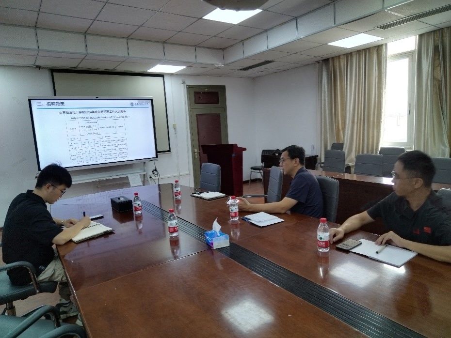 中国地质大学(北京)能源学院张元福教授、郭建平教授,中国石油大学(北京)地球科学学院副院长姜福杰教授等多位老师以及30余名博士生通过现场和线上方式参会。王蛟副院长全面介绍了山东石油化工学院的发展历程、学科建设成果以及所取得的优异成绩,详细阐述了学院高层次人才招聘情况,并与参会博士生就学科发展规划、人才引进政策、人才考核标准以及待遇福利等大家关心的问题进行了一一解答,并诚挚邀请优秀博士加入山东石油化工学院。